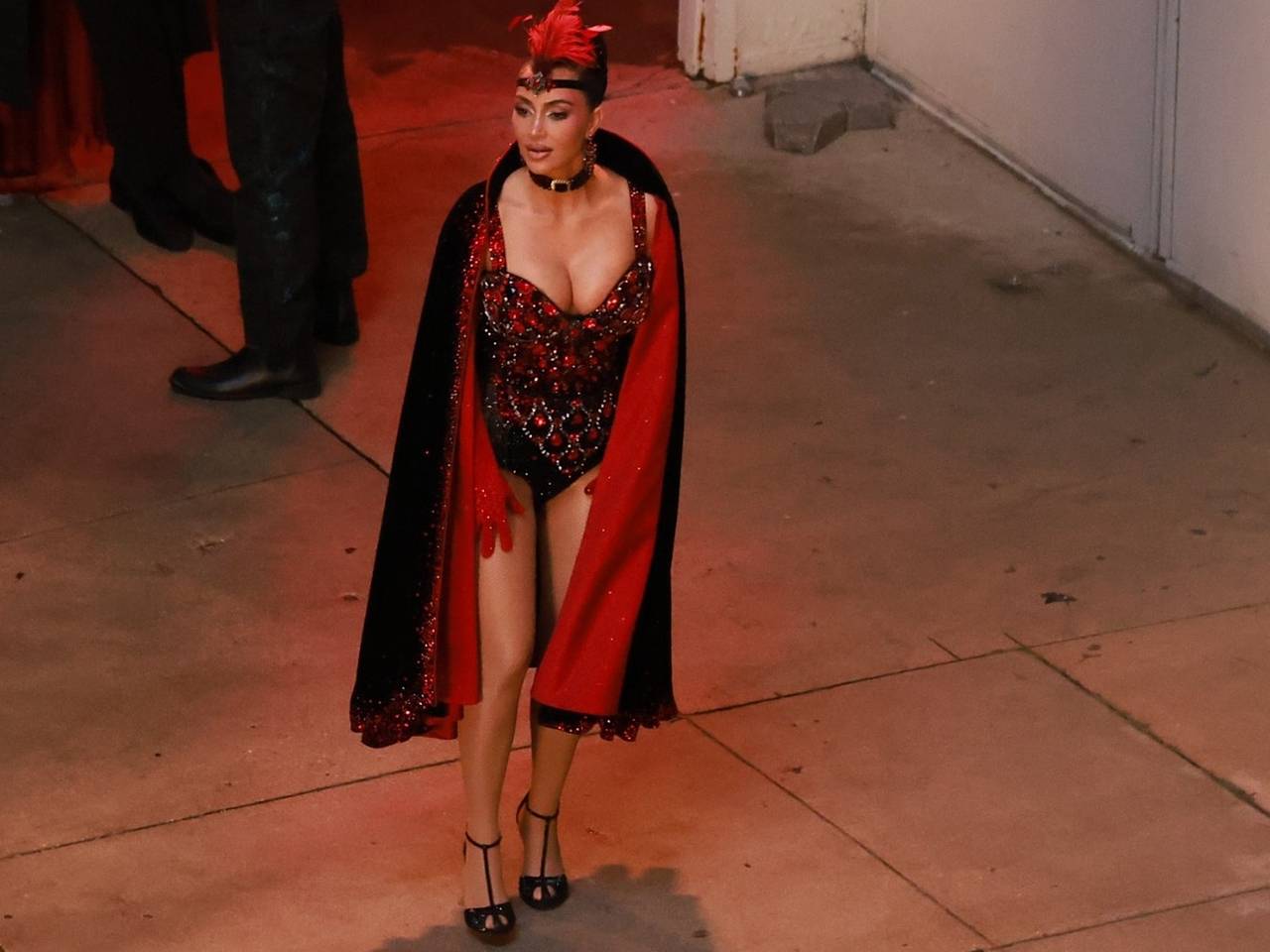 45-летняя инфлюэнсерша попала в объективы папарацци в черном боди, расшитом многочисленными красными камнями разной величины. Свой образ она дополнила головным убором из перьев, накидкой и туфлями на каблуках. Кроме того, ее наряд украсили длинные красные перчатки.