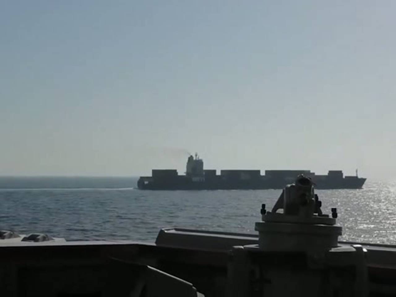 На видео запечатлены переговоры между экипажами кораблей, а также последовавшие в сторону торгового судна выстрелы.